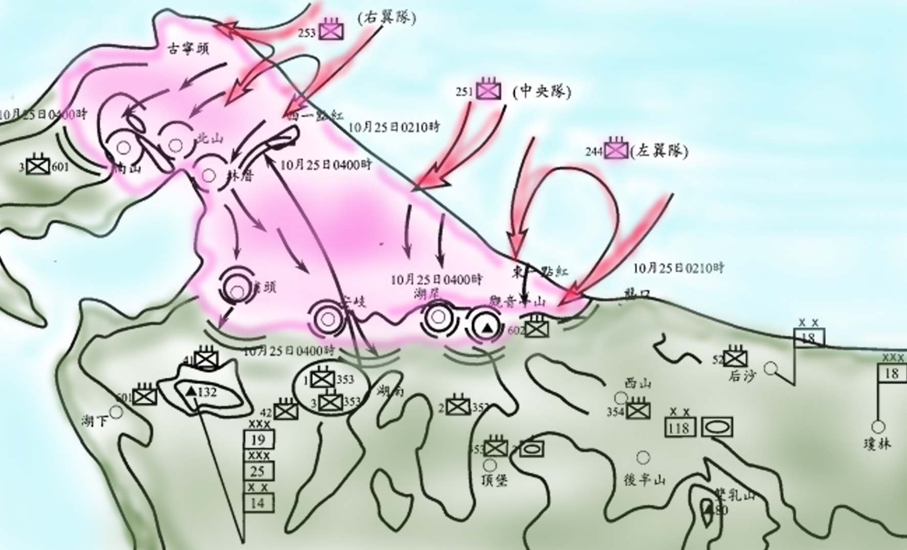 25日晨4時前後,敵第251團1營迂迴觀音亭山,奪佔湖尾鄉高地,一部份並前進至西堡,但繼續進攻時,在湖南高地西端,與已先到達該地之敵第253團1營相遇,因夜暗誤會,以致自相混戰,激戰至拂曉,傷亡頗多,因此該兩部共軍停滯於該地,惟其左右兩翼則仍繼續向南進攻。